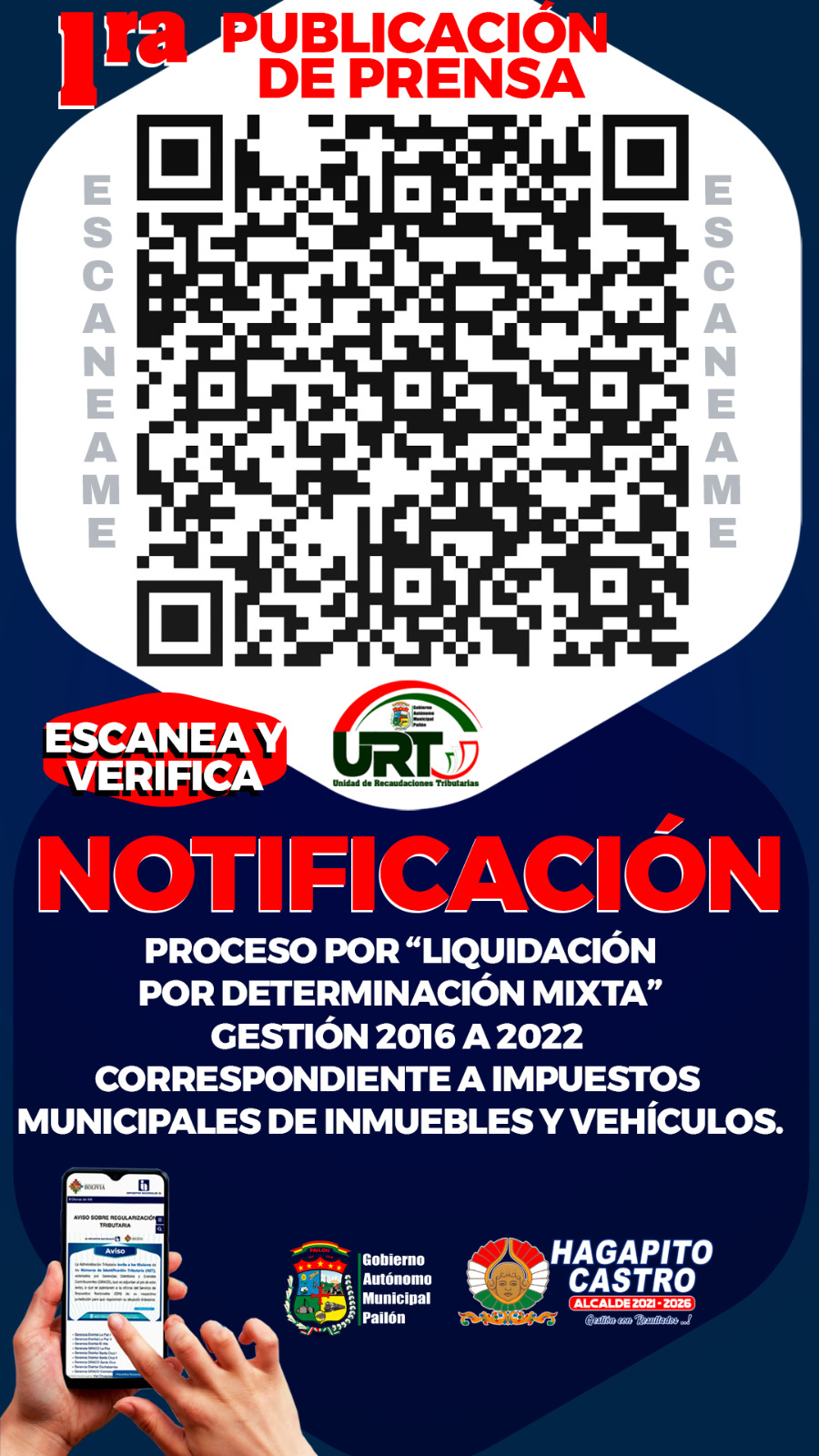 La Administración Tributaria Municipal (ATM) del Gobierno Autónomo Municipal de Pailón (GAMP), en cumplimiento a lo previsto en el Art. 89 de la Ley N° 2492 del Código Tributario Boliviano), el Art. 13 del Decreto Supremo 27310 y la Resolución Administrativa 04/2024 de notificaciones masivas publicada en fecha 01/10/2024 cita a la generalidad de personas (contribuyentes y/o sujetos pasivos) que se nombran a continuación cuyos registros tributarios cuentan con adeudos impositivos por concepto de Impuesto Municipal a la Propiedad Bienes Inmuebles e Impuesto Municipal a la Propiedad Agraria, para que dentro de un plazo de cinco (5) días hábiles administrativos se apersonen a la oficina de la Administración Tributaria del Gobierno Autónomo Municipal de Pailón (GAMP) ubicada en la Av. 13 de mayo frente a la Plaza Principal, a objeto de notificarse con la «Liquidación por Determinación Mixta» emitida en aplicación del numeral 3 del Artículo 93 y parágrafo III del Artículo 97, ambos de la Ley N° 2492 (Código Tributario Boliviano) y la Resolución Municipal N° 02/2024 de Procedimiento para la Liquidación por Determinación Mixta,